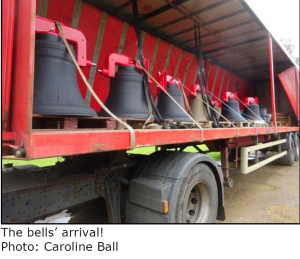 The local farmer kindly lent a tractor and farm worker to move them, first off the lorry then around to the church. It was fascinating watching Ian Hasman, the bell hanger, positioning them as they came off the lorry. Anyone who’s been involved with a rehang will know that nothing is done without a reason, and the bells were placed in not a random order, but the order they needed to go into the church and up into the tower. A short service was held to dedicate the new bells and bless the rest, with the tenor arriving to start the service for all to wonder at its huge size.